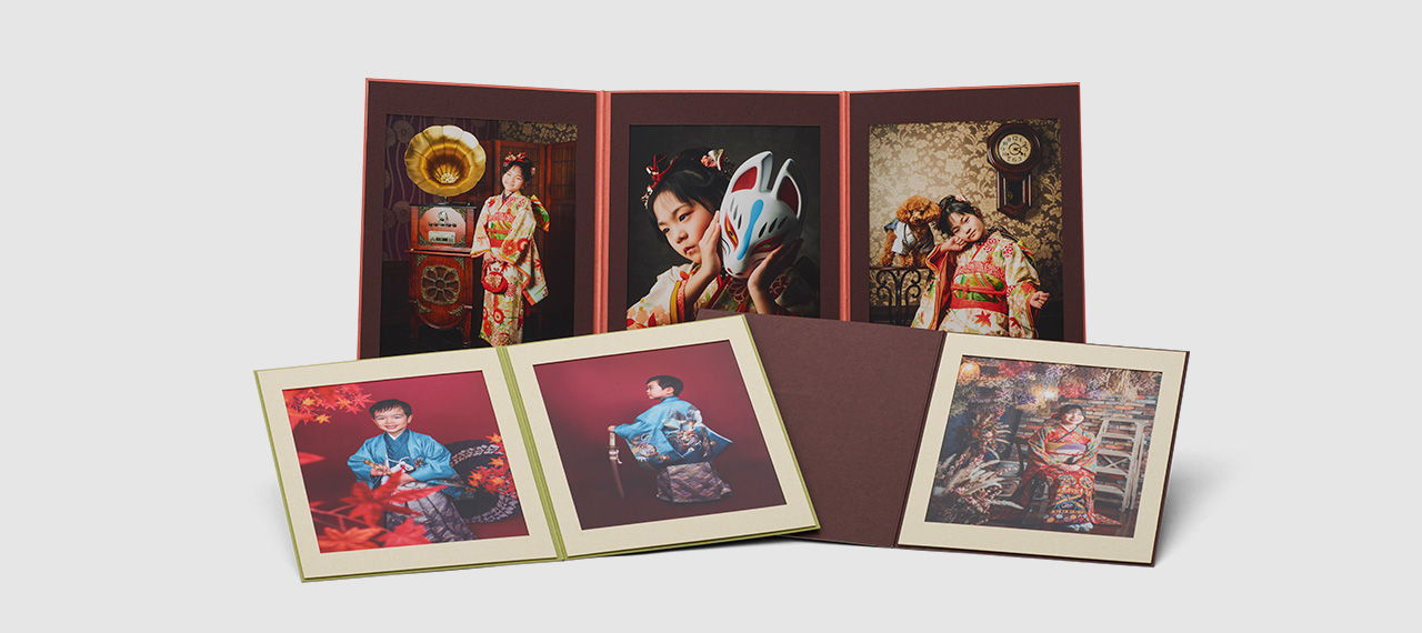 しなやかで風合いのあるSHIRONARI用紙の糸綴じ製本。こだわりの製本技術を保ちつつコストパフォーマンスにも優れています。サイズは2種類。デザインできる封筒が付属し、予算が限られた多部数の作成にも最適です。